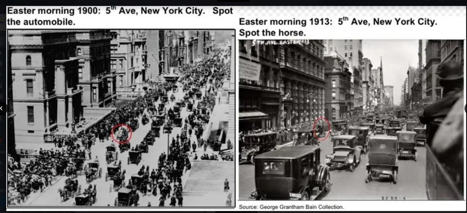 13 years makes all the difference: from horse-drawn carriages to the horseless carriage: innovation goes fast. George Grantham Bain collection